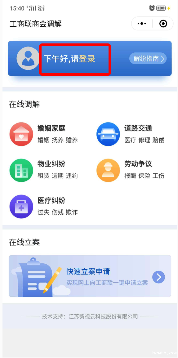 第一步:进入【工商联商会调解】小程序,登录小程序账号,若没有账号需要先注册。