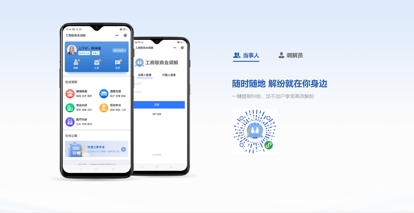 方式:可在首页上方点击“下载中心”,进入软件下载页面,扫描“当事人”二维码,进入【工商联商会调解】小程序。