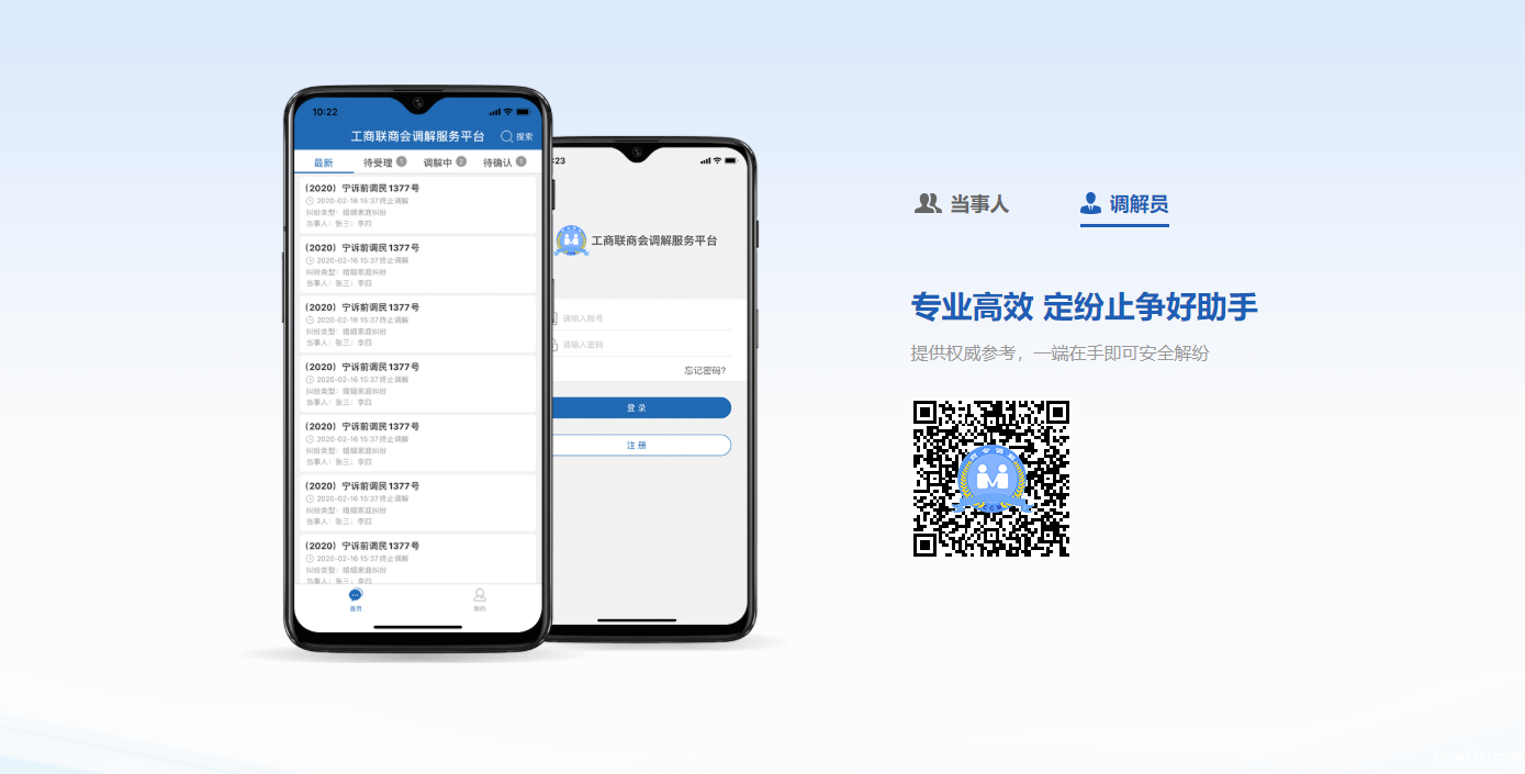 方式:可在首页上方点击“下载中心”,进入软件下载页面,扫描“调解员”二维码,进入【工商联商会调解服务平台】调解员APP。