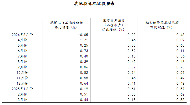 (2)根据季节调整模型自动修正结果,对近一年来各期国内生产总值、规模以上工业增加值、固定资产投资(不含农户)、社会消费品零售总额环比增速进行修订。修订结果及2025年一季度GDP环比数据、2025年3月份其他指标环比数据如下: