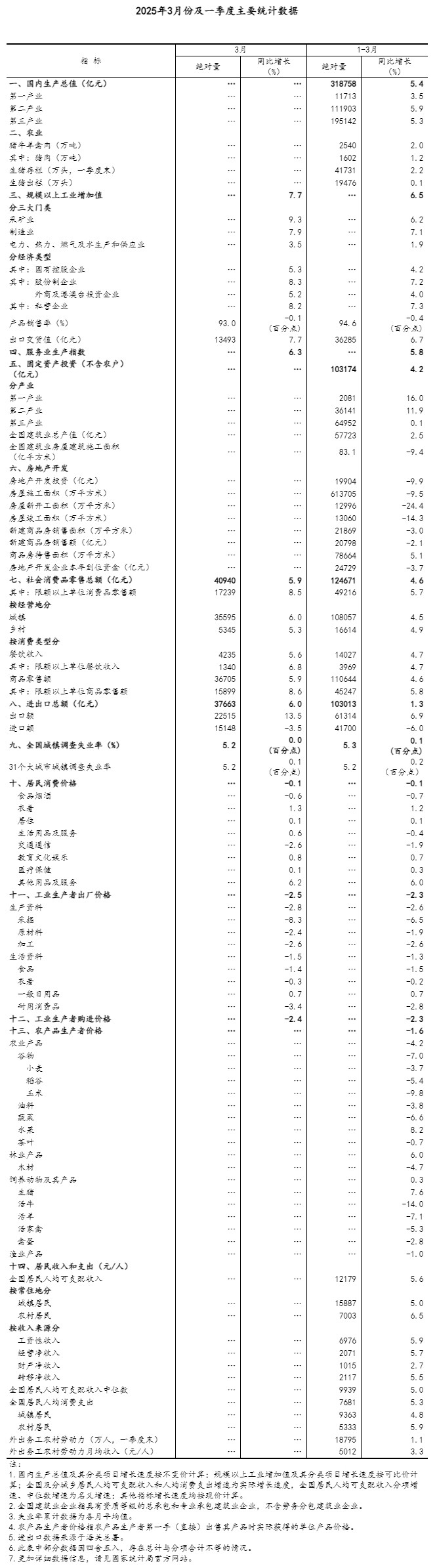 初步核算,一季度国内生产总值318758亿元,按不变价格计算,同比增长5.4%,比上年四季度环比增长1.2%。分产业看,第一产业增加值11713亿元,同比增长3.5%;第二产业增加值111903亿元,增长5.9%;第三产业增加值195142亿元,增长5.3%。